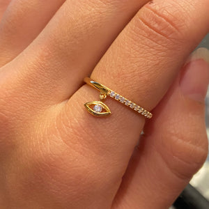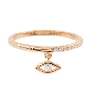 An evil eye charm dangling from a pave band ring.