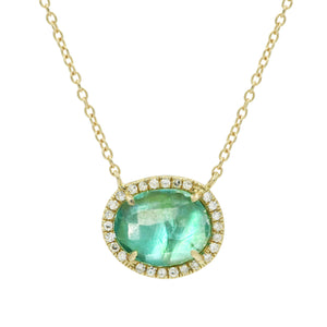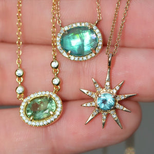 This stunning blue-green apatite stone doublet has a pearl backing to give it an added iridescent glow. The apatite is surrounded by diamonds to give that extra sparkle you need! The apatite stone promotes openness and motivation. This fine necklace is dainty enough to wear every day, but its glowing colors are sure to stand out.18" gold chain with adjustable slider in 14K yellow gold.