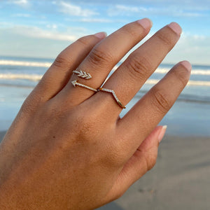 New! This is one of those rings you never seem to take off. Made with mini diamonds and solid 14k yellow gold, this ring is sweet, flirty, and sparkly. The arrow is a reminder to always look forward and aim for your goals. Sometimes life can be challenging and you can feel like you are stuck. Always remember to take one step forward at a time and trust in the future. This ring is a size 6 We can custom make this ring in any size. For a request, please email us at contact@kamaria.com.