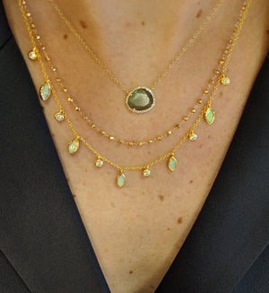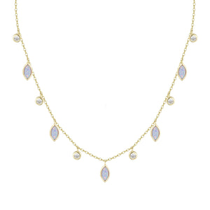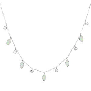 This necklace features a graceful sequence of marquise-cut opal drops alternating with sparkling cubic zirconia, creating a flowing pattern of iridescence and shimmer. The opals shift in color like springtime blooms, while the CZ accents add a refined sparkle that catches the light with every movement.