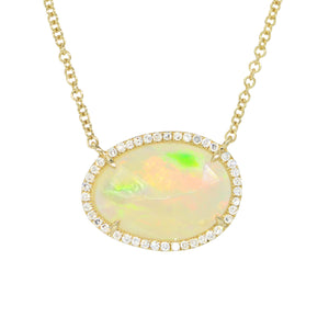 This Ethiopian opal has a unique and lovely shape. It has a bright fire color to it, with all colors of the rainbow, mimicking a beautiful colorful galaxy! Sophisticated and classy, this necklace is sure to wow! It is surrounded in mini diamonds for the ultimate sparkle and set in 14k gold.