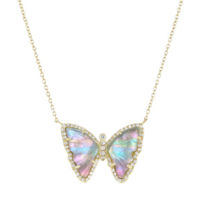Stunning and one-of-a-kind, this Fairy Tourmaline Butterfly Necklace is set with a pearl backing and mini diamonds. It is a truly stunning piece. The pearl adds an iridescent glow, with the diamonds add just the perfect amount of sparkle! Butterflies represent hope and transformation.