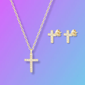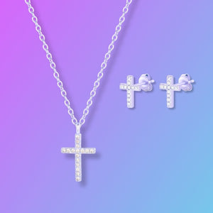 This gift set comes with a cross necklace and matching studs! A mini cross necklace with crystals with matching cross studs. The perfect meaningful necklace for every day! This comes with an adjustable slider so that it can be worn any size up to 18 inches.