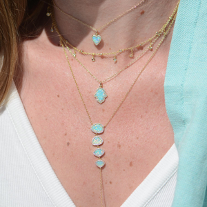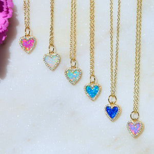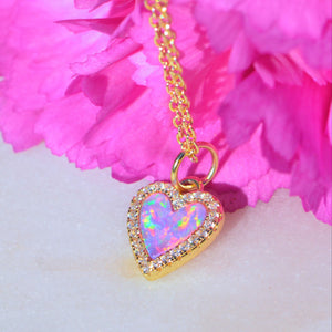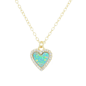 Lab-created round opal heart necklace surrounded by sparkling crystals. Set in 925 Sterling silver and plated in gold. Wear alone everyday or add to other layering pieces for a pop of color.The chain is 925 Sterling silver and is adjustable from choker length to 18 inches with slider ball.