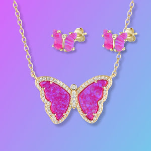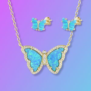 This gift set includes one opal butterfly necklace plus one pair of opal butterfly studs.