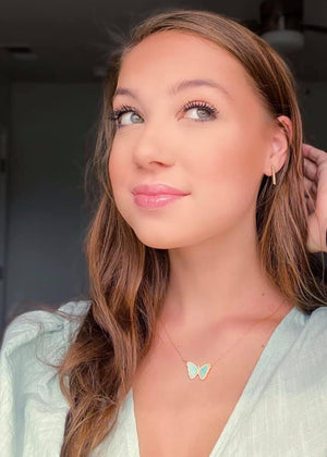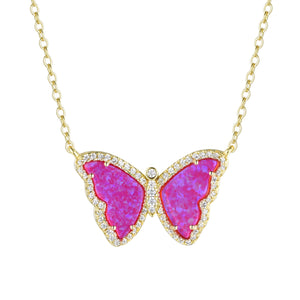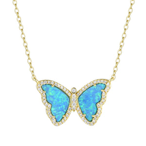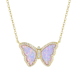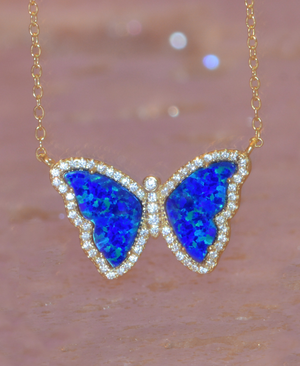 Best Seller! The most beautiful and delicate opal butterfly necklace is made with lab-created opal and set in 925 sterling silver. The butterfly wings are surrounded with pave crystal for an added sparkle. Butterflies represent hope, rebirth, and transformation. Pair this necklace with our opal chokers or your favorite gold chain for a fun layered look. <3