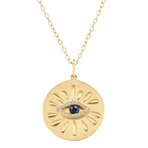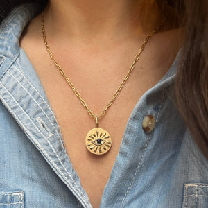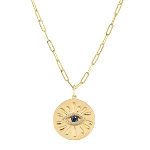 This is a large, beautiful gold disk and evil eye charm necklace with diamonds and a blue sapphire in the center. It has a gorgeous brushed gold finish, with high polish with the rays emitting out from the center. Available in plain cable chain, a sparkly diamond-cut ball chain, and the bold paperclip link chain.