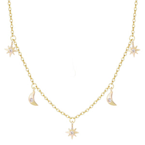This layered necklace captures the quiet beauty of the cosmos. The chain features a delicate pattern of alternating moons and stars, each symbol a reminder of intuition, wonder, and light in the darkness.