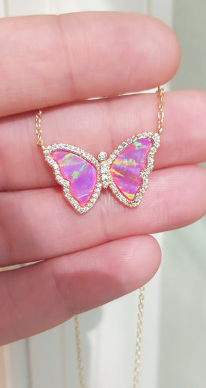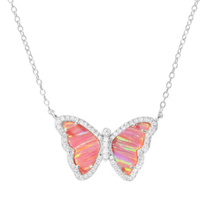 These delicate butterflies are made with lab-created opal and set in 925 sterling silver.  The wings are surrounded with pave crystal.  Pair with our opal chokers or your favorite gold chain.  The 18 inch chain is sterling silver with an adjustable slider ball.