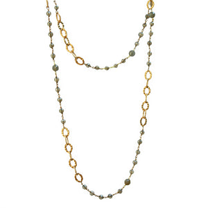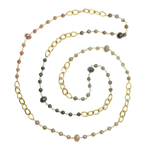 Hand-beaded gemstone necklace with gold-filled chain links. Available in mystic black spinel and mystic smoky quartz. 36"