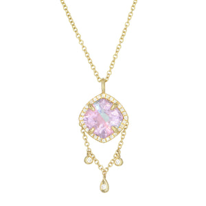 This dreamy necklace features a pink, lavender and blue nano gem—glowing with delicate, shifting hues like the sky at first light, with a trio of teardrop-shapes suspended gracefully on a fine chain, catching the light with every movement.