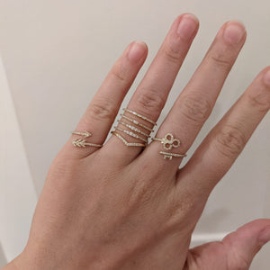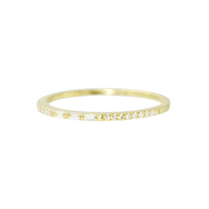 New! This is one of those rings you never seem to take off. Made with baguette and round diamonds and solid 14k yellow gold, this ring is sweet, flirty, and sparkly. The band is thin, yet strong and perfect for stacking. This ring is a size 6.5 We can custom make this ring in any size. For a request, please email us at contact@kamaria.com.